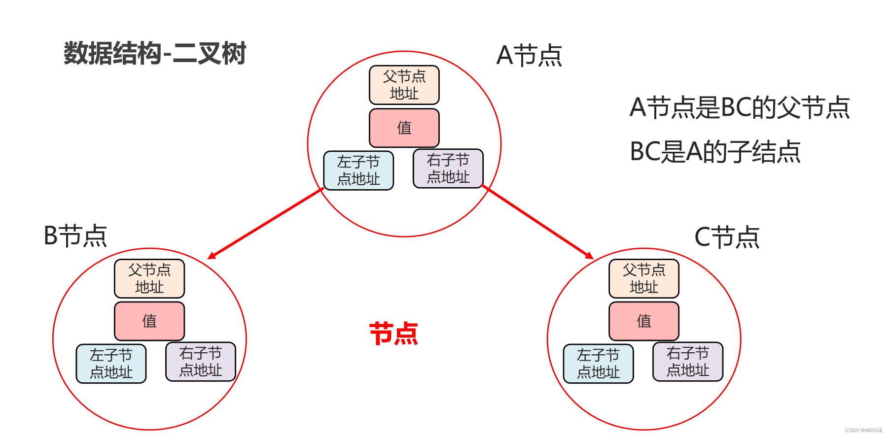 每一个节点可以存四个值 父节点地址值 自己存的值,左子节点地址值 右子节点地址值