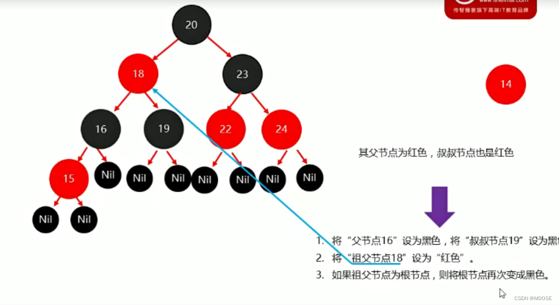 父节点为红,叔叔节点也是红