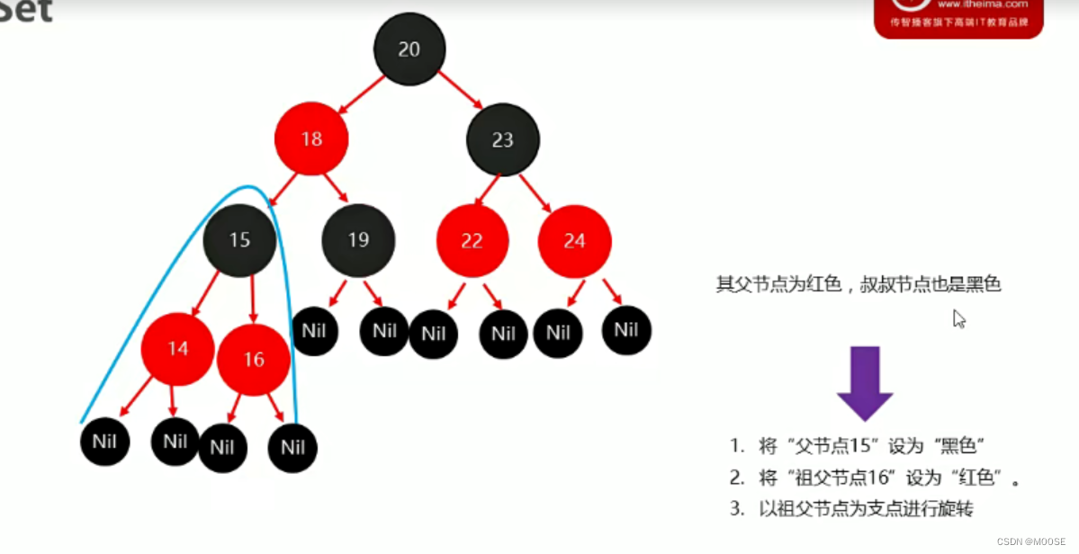 父节点为红,叔叔节点是黑色
