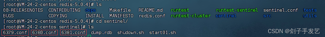 (1)这里 我们在新创建好的sentinel中创建五个文件:6379.conf、6380.conf、6381.conf、还有两个脚本文件:start01.sh、shudown.sh