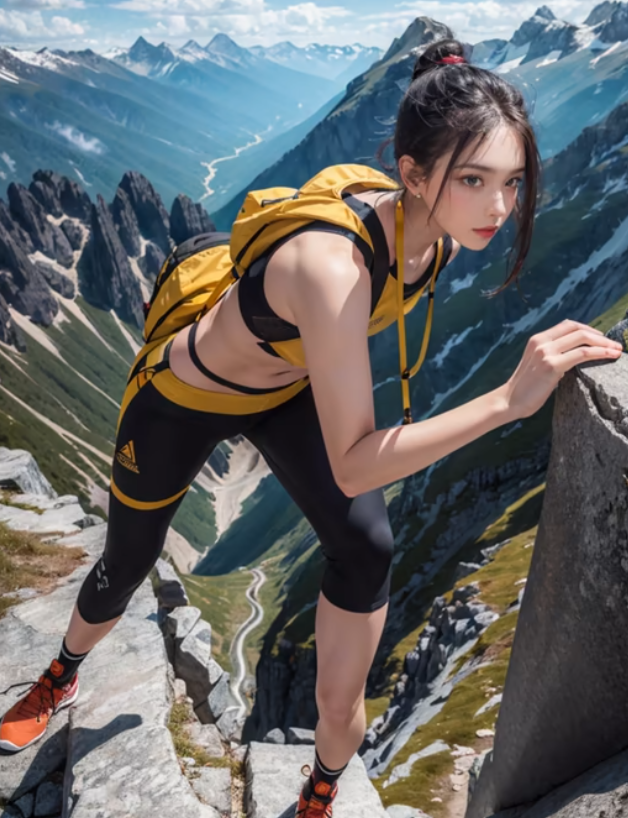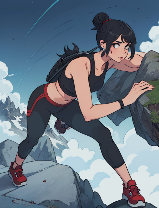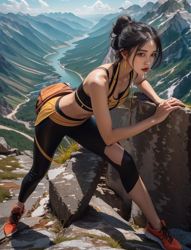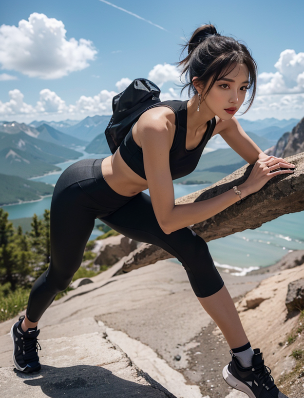 1girl, mountain, backpack, solo, bag, outdoors, shoes, navel, sports bra, sneakers, midriff, black hair, sky, pants, day, ponytail, leggings, rock, mountainous horizon, lips, black leggings, full body, cloud, standing, black pants, looking at viewer, hair bun, sleeveless, red footwear, yoga pants, socks, crop top, closed mouth, black sports bra, earrings