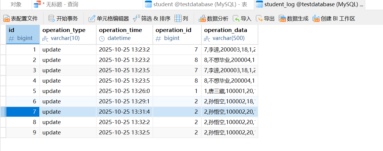 这里还是以student表来进行演示,本文就以一个更新触发器示例来演示触发器的功能,其他触发器可由读者自行尝试。