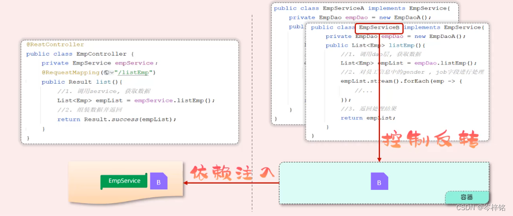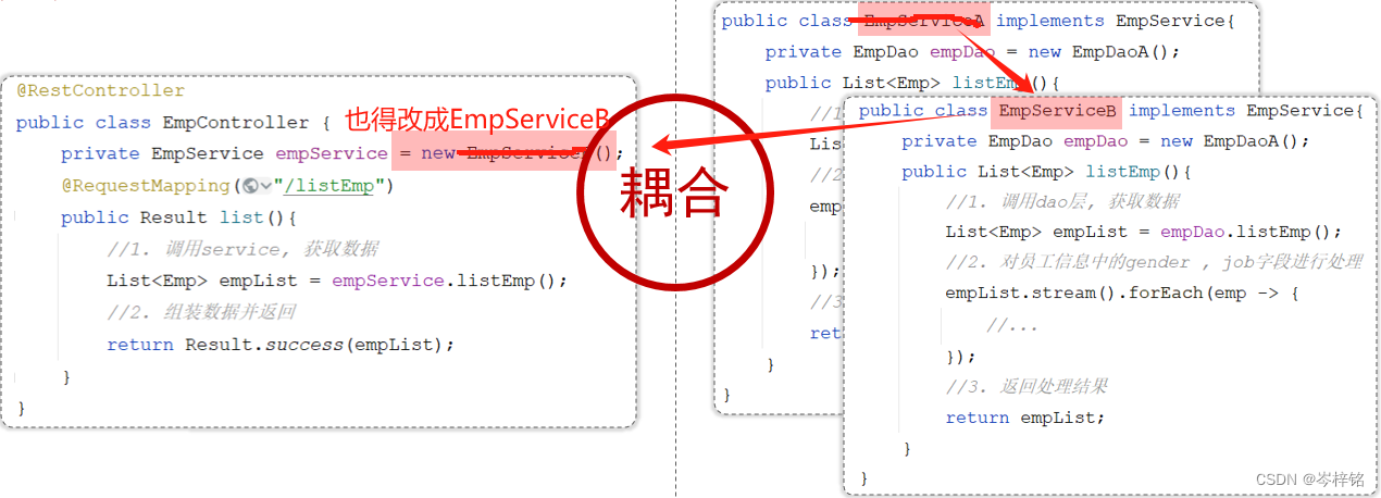 比如【Controller】接收到前端请求后,找数据需要通过调用【service】来获取数据,而【service】找数据也得靠调用【Dao】来获取数据,这种联系就叫【耦合】