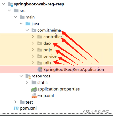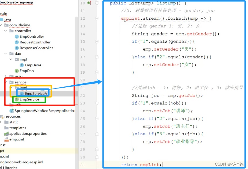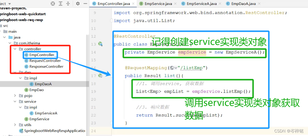 4、最后,创建【controller】目录,把一个【请求处理类】放到【controller目录】——>【然后现在完整、处理好的数据源在service实现类】——>【在方法外面创建service的实现类对象】——>【然后方法里调用service实现类对象,拿到数据】——>【然后通过请求return出去,响应给前端】
