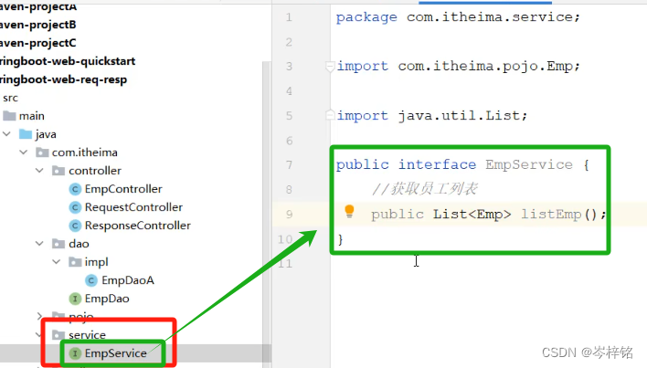 3、然后同样的流程【创建service目录】——>【创建代表数据的接口】——>【然后创建(连文件夹包一起)实现这个接口的实现类】——>【记得先创建并调用Dao的实现类对象,因为现在数据在Dao那】——>【然后service的实现类的内容就是处理数据的逻辑】