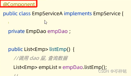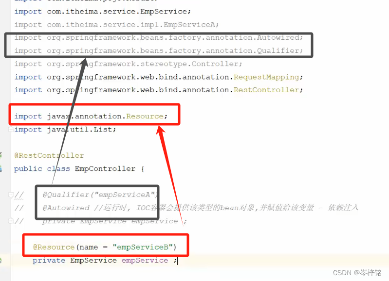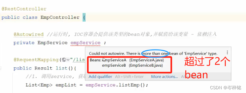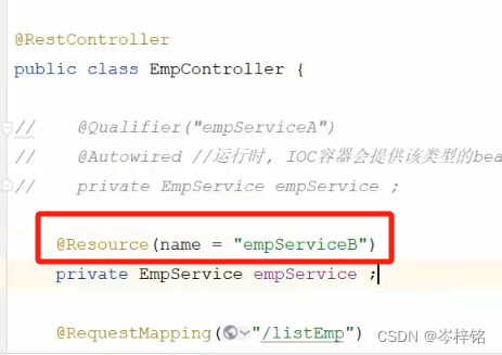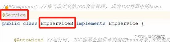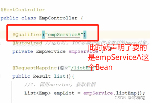另外解释为什么【实现类EmpServiceA】在@Qualifier这要写成【empServiceA】,因为我前面懒,省略了讲:Bean对象的名字其实是【实现类】名字的首字母小写......而不是它原本的实现类的那个名字