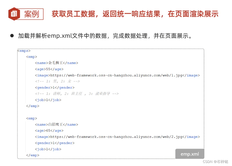 这里我先解释一下黑马程序员里的这个案例,兄弟们看视频的可以跳过这节课:Day05-08. 请求响应-响应-案例_哔哩哔哩_bilibili 看我这里的解说就可以,因为他这里把前端的文件塞到后端这里弄,还要解析XML文件来获取数据,完全没必要,没有任何地方会这样做了,直接看我的解释过一遍就行