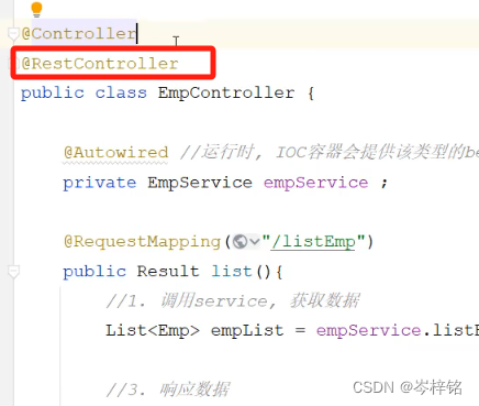 但是spring boot的web开发里,【Controller】控制器不能用【Component】,不过它除了注解【@Controller】,我们之前讲过【@RestController】也包含了【@Controller】,所以用【@ReastController】就可以了