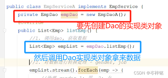 3、Serivce层调用Dao层(逻辑处理过程中需要用到的一些数据要从Dao层获取)