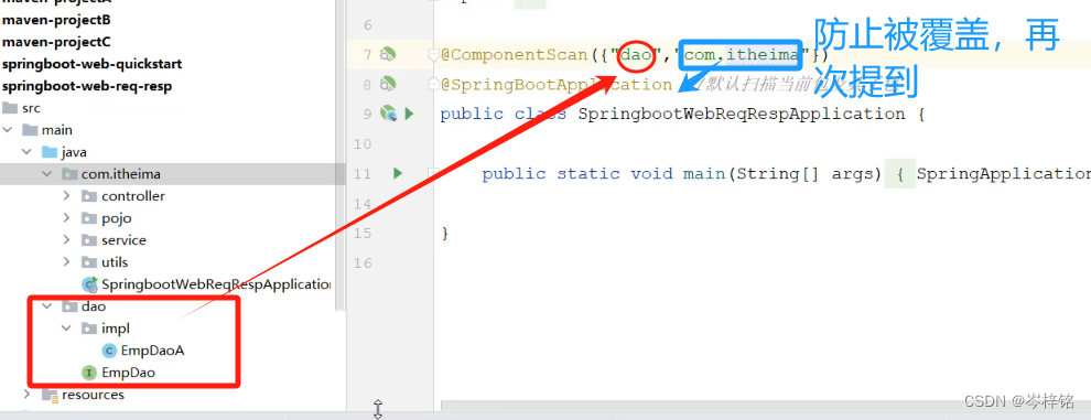 那这是才只能手动写【@ComponentScan】来导入要扫描的“包(目录)”,并且还得带上原本当前这个“包(目录)”,因为会覆盖下面的【@SpringBootApplication】