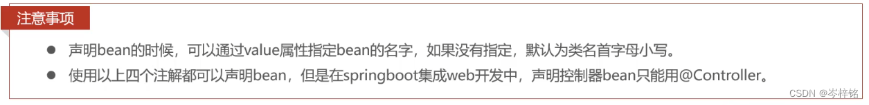 | @Component | 声明bean的基础注解 | 不属于以下三类时,用此注解 |