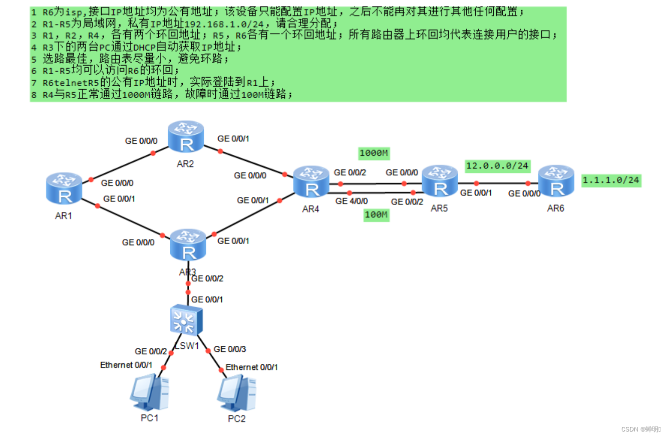 BGP基础配置 3、R4和R5之间使用环回接口建立EBGP对等体关系,并补充配置缺省路由,然后修改TTL数值,确保TCP会话正常建立;6、R2、R3、R4之间配置OSPF协议,保证各设备之间的网络互通,且通过重发布的方式发布路由;5、为了保证每个设备的BGP路由表的下一跳属性正确,需要在R2和R4上将下一跳属性修改为本地;NextHop:谁发送的路由信息,下一跳就为谁。保证每个设备的BGP路由表的下一跳属性正确,在R2/4上将下一跳属性修改为本地。2、R2、R3、R4使用环回接口建立非直连的IBGP对等体关系;