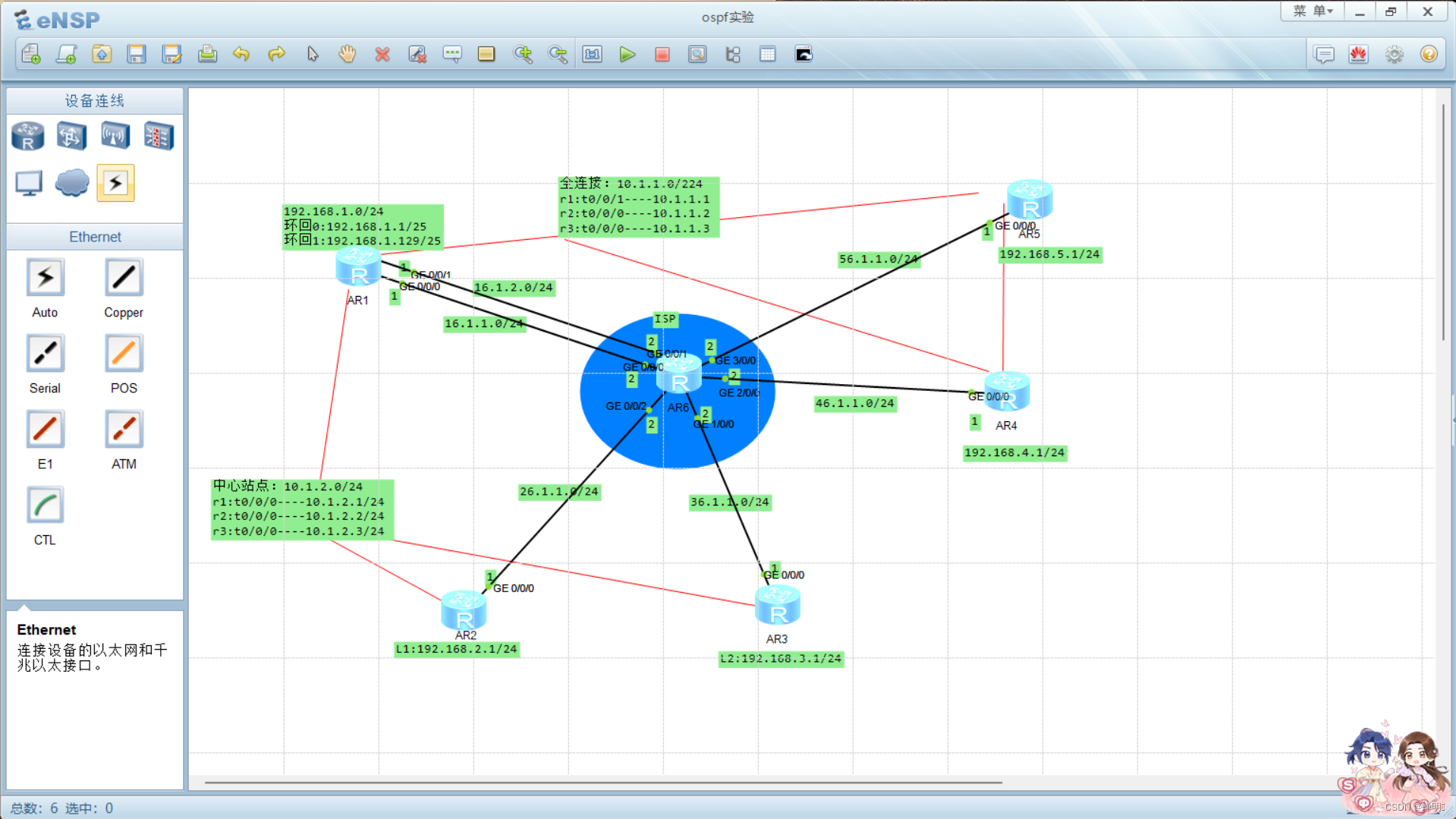 静态路由实验 r4自身有r4-r3、r4-r2、r4-r5和r4的环回共6个直连路由,全而全网共16条路由,所以r4需要配置10条路由,才能保证r4的网络能通。r1自身有r1-r2、r1-r3、两个环回共四个直连路由,而全网共16条路由,所以r1需要配置12条路由,才能保证r1的网络能通。r2自身有r2-r1、r2-r4、两个环回共四个直连路由,而全网共16条路由,所以r2需要配置12条路由,才能保证r2的网络能通。R6 telnet R5的公有IP地址时,实际登陆到R1上;r1-r5都可以到达r6的环回。