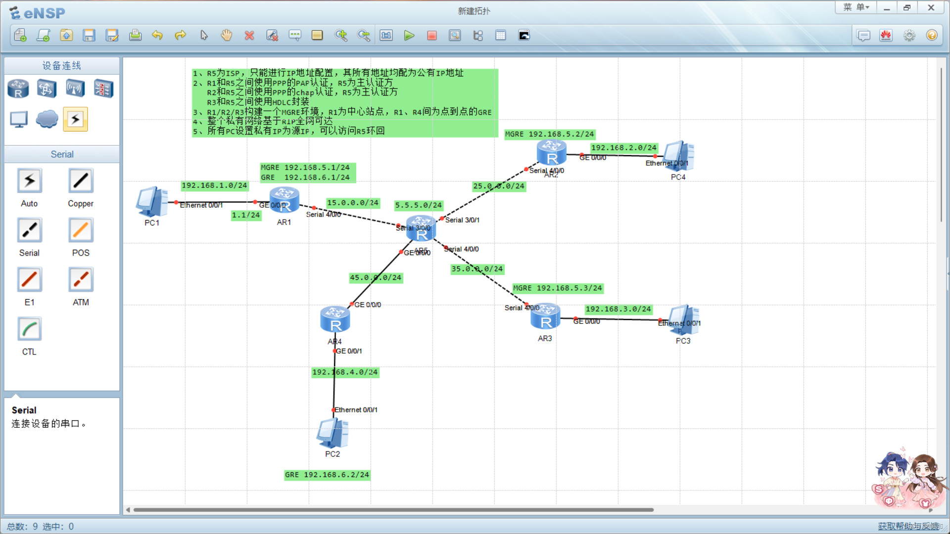 DSVPN实验报告 1、为所有路由器设备进行IP配置2、r1和r5进行PPP的PAP认证;r2于r5之间使用PPP的chap认证;r3于r5之间使用HDLC封装。3、构建MGrE环境;构建GRE4、RIP全网可达5、PC访问r5。