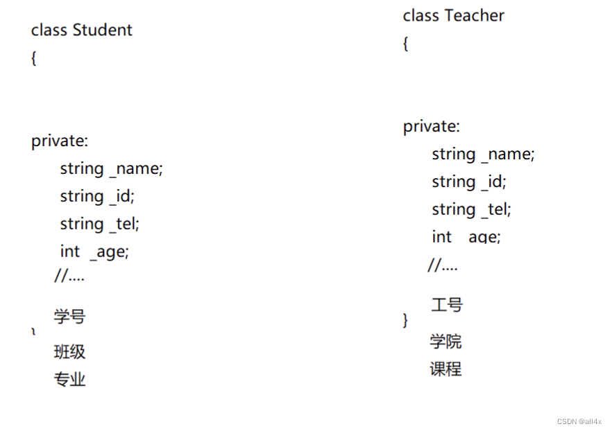 [C++进阶]继承详解 class +派生类:继承方式 +基类string _id;//学号int _major;//专业public://工资char _jnum;//工号学生和老师都有相同的属性:名字,电话号码,年龄。学生独有的:学号,专业。老师独有的:工资,工号。所以,我们将名字,电话号码,年龄提取出来定义为父类。而学生类和老师类里只声明他们各自独有的属性。在定义子类的时候,我们可以发现继承方式和访问限定符相同。
