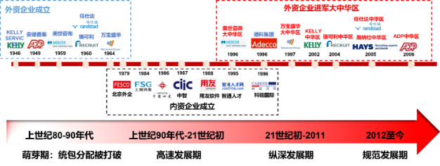 - 21 世纪初 -2011 年:纵深发展期 ,行业逐步进入纵深发展期,人力资源 的服务内容和边界的到拓展。 大型跨国企业在华业务持续拓展及 2008 年 《劳动合同法》颁布背景下,人力资源服务的内容及边界不断得到拓展, 各细分领域涌现出一批具有代表性的企业。