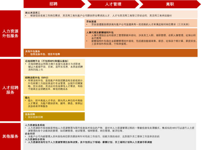 目前中国人力资源服务行业主要由人力资源外包服务、人才招聘服务、其他 服务组成,覆盖由招聘到离职的各个环节。 其中,人力资源外包服务主要包括灵活 用工(狭义)、劳 务派遣、人事代理及薪酬福利外包、其它外包服务等;招聘业务 分为在线招聘、招聘流程外包、猎头等模式;其他服务包括人力资源信息系统、企 业内训和综合咨询等细分环节。