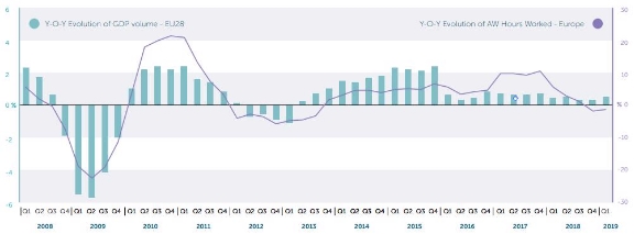 图 19 : 欧洲人力资源机构工作时长与 GDP 增速关系