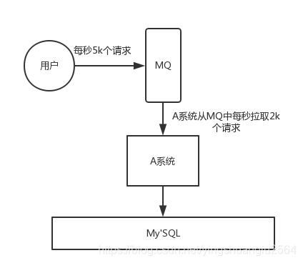 - 流量削峰:当处理高并发请求时,消息队列可以通过缓冲请求,平滑处理高峰期的流量,避免系统崩溃。例如:A系统在高峰期每秒接收5000个请求,但只能处理2000个请求,通过消息队列可以将多余的请求暂存,逐步处理