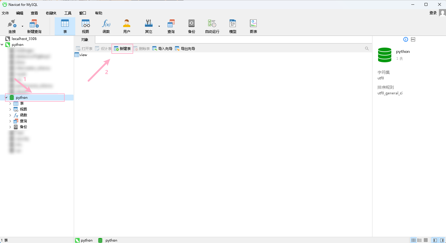 双击刚连接到的MySQL数据库,从原本的灰色变为绿色,说明数据库连接成功。找到我们的python库,点击新建表。