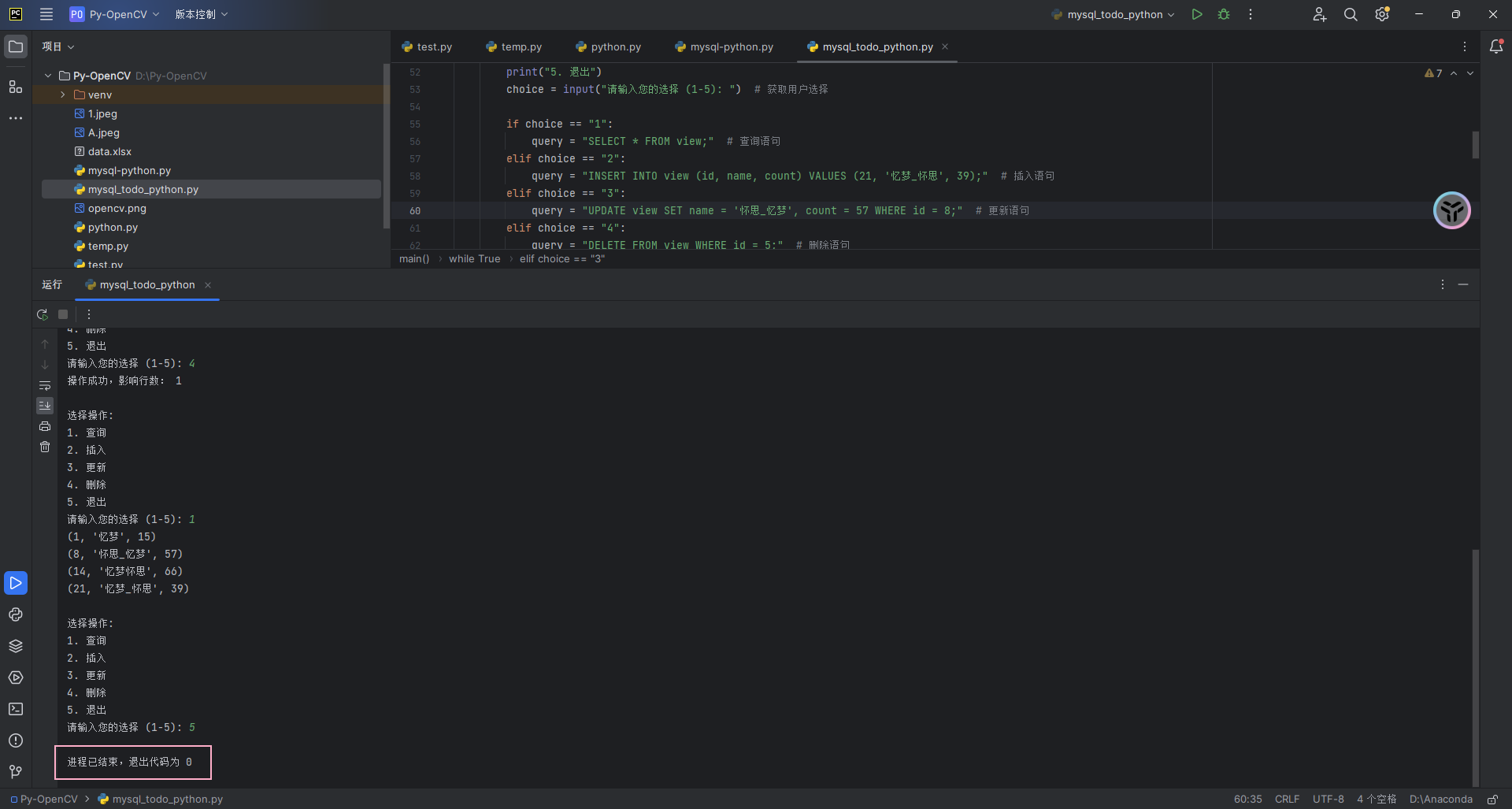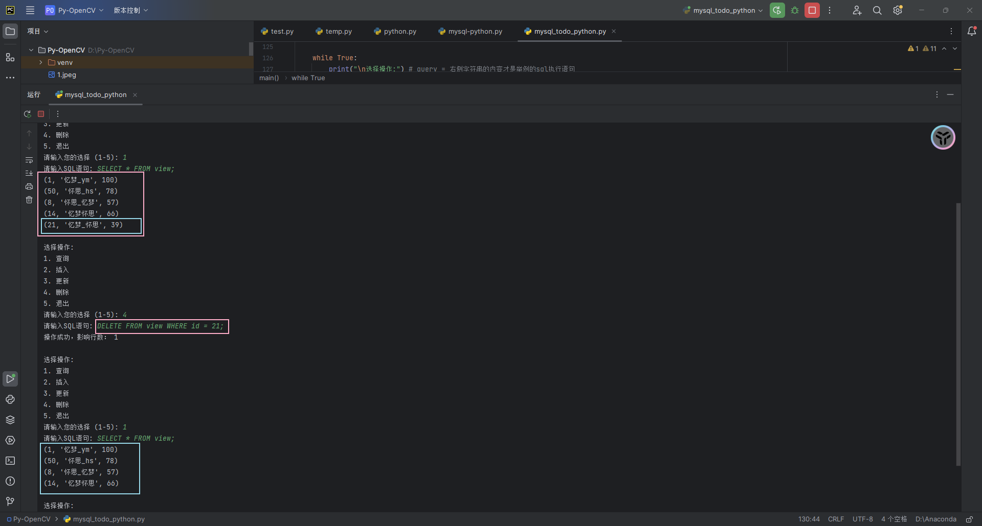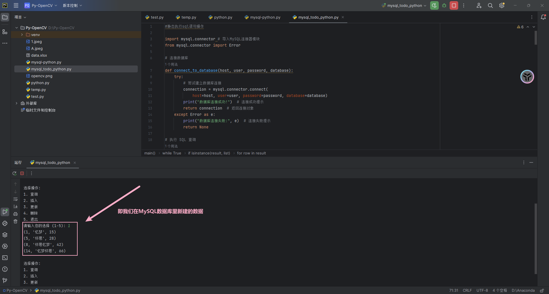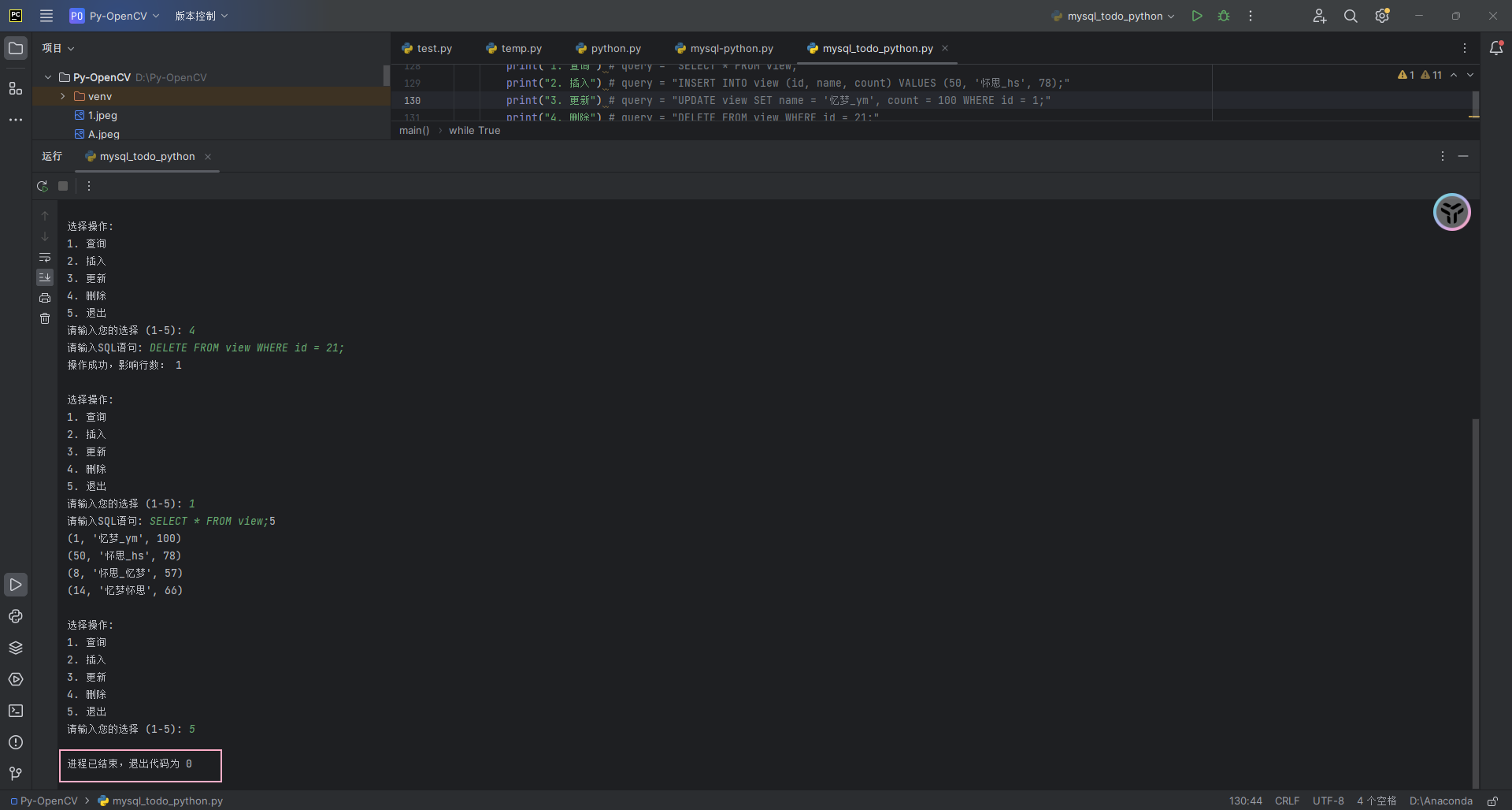 这样我们就实现了利用python代码对于数据库的查询、插入、更新、删除等操作。