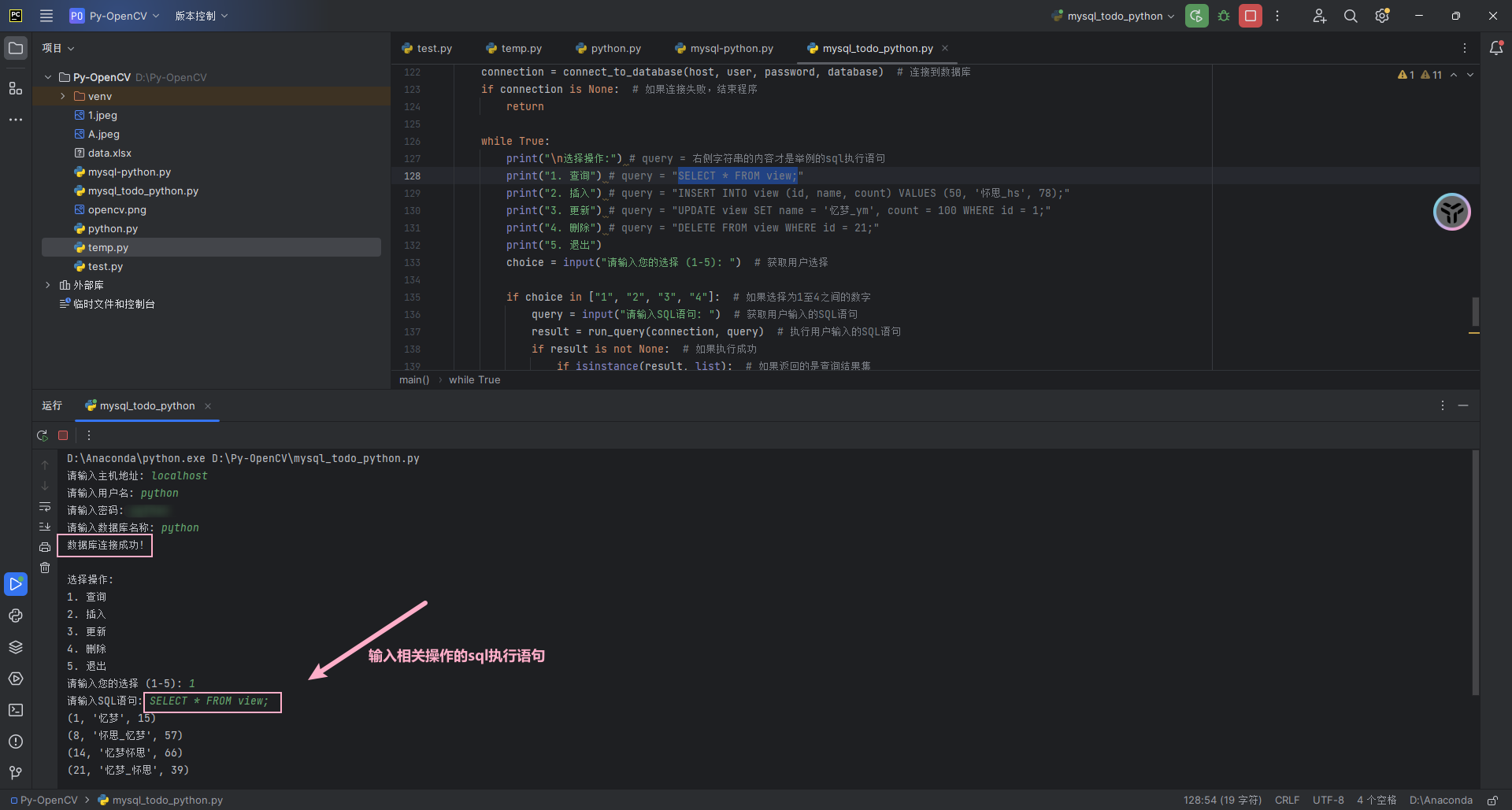 执行1操作,这里就不是像静态那样直接输入选择就能执行sql指令的,需要自己输入对应的sql语句才能进行相应的操作。比如我输入SELECT * FROM view;