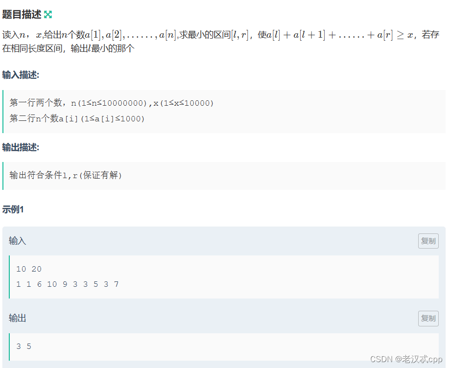 使用滑动窗口要特别注意,这道题所给的数组的元素的大小是大于0的!如果小于0就不能使用滑动窗口了,因为它不满足单调性了。