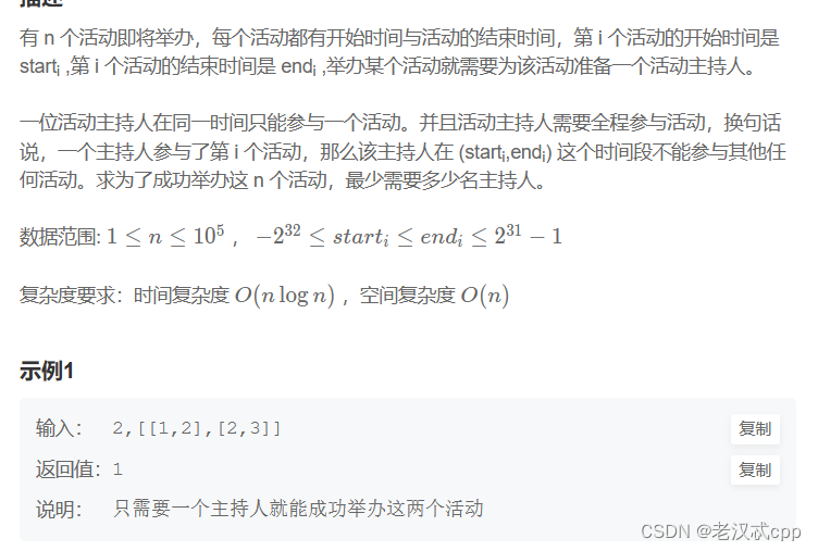 我们判断是否要增加主持人的依据是,以此遍历这个数组,如果s[i][0]小于每一行最后一个数的右端点的值话,就说明需要加一行了(也就是加一个人),否则就可以将它放到某一行的末尾。