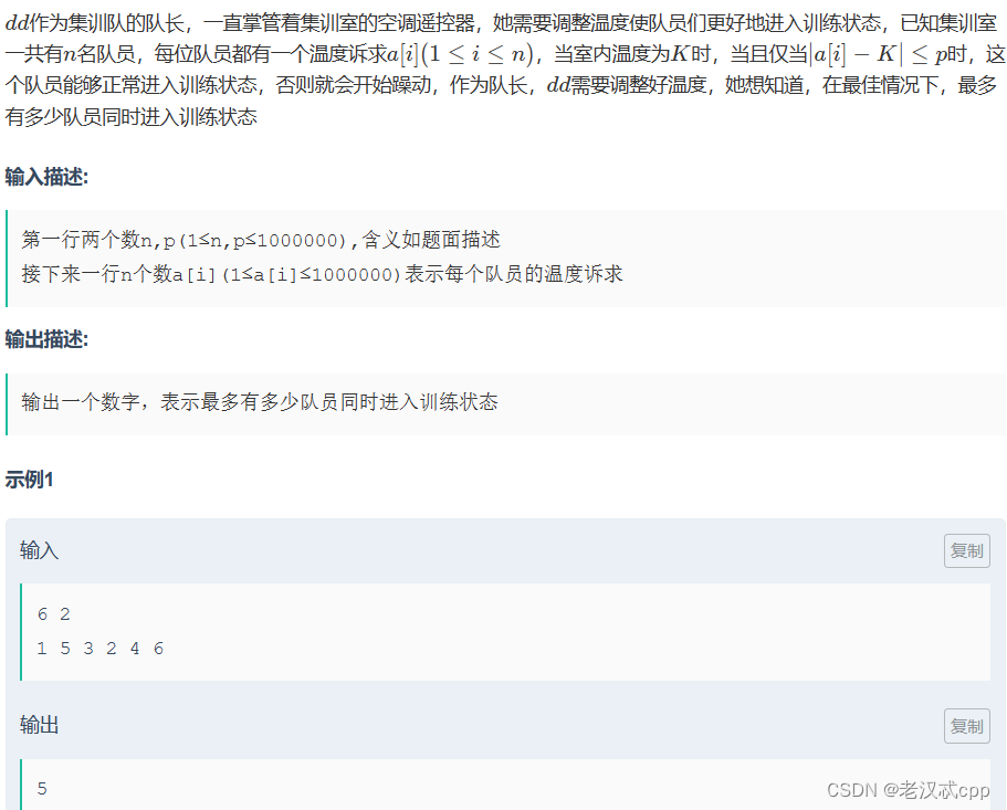 在枚举这一步我们是没法优化的,但是在查找的时候是可以优化,在排序后,我们依然枚举温度,不过我们只需要通过二分法找到在这个温度下,忍耐值最小的下标left,和忍耐值最大的下标right,将它们right - left + 1就是本次枚举的结果。简而言之就是每次枚举的温度t,看看数组中有多少个数是在[t - p,t + p]之间的即可。