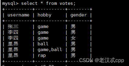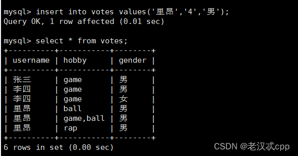 insert into votes values('张三','game','男');