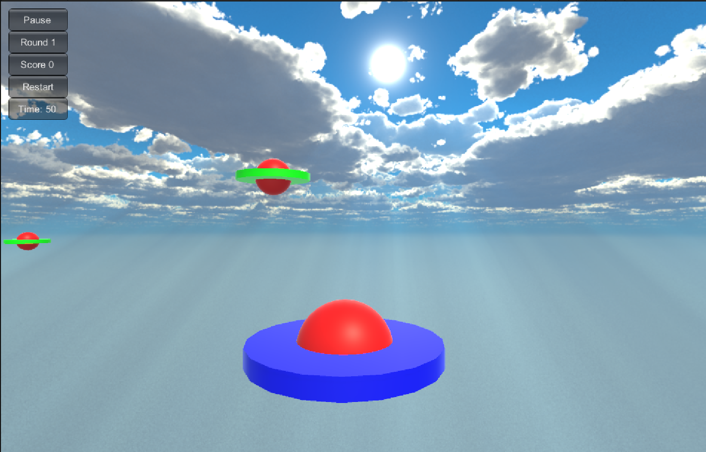 Unity3d游戏——打飞碟 1.游戏有 4 个 round,每个 round 中玩家需要通过射击足够数量的飞碟达到积分要求以进入下一轮,倒计时结束前没有进入下一轮即为游戏失败,通过四轮后游戏成功。2.每个飞碟的色彩、大小、发射位置、速度、角度、同时出现的个数都可能不同。3.round轮数越高,飞碟越快,总体难度随 round 上升。4.在游戏过程中可以通过暂停按钮暂停游戏。