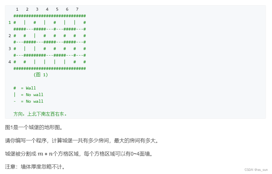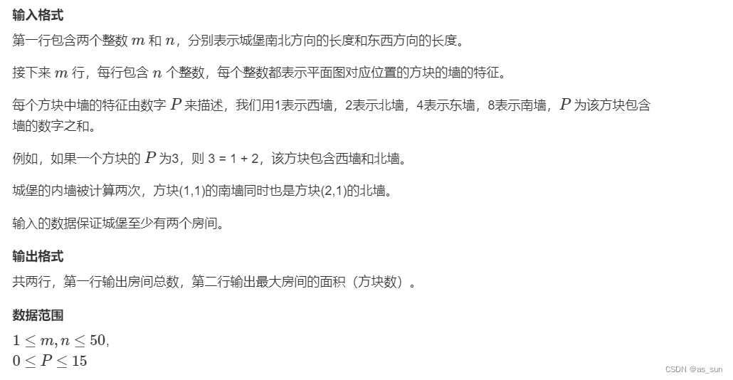 思路:这题看上去比较麻烦,因为它不是相邻的格子有阻碍,而是用一个数来表示当前位置四周的情况,而且这里还需要求面积。我们先来看它给定的数1,2,4,8,显然就是二进制数的某一位,那么我们实际上可以直接bfs,用该点上的数来判断将要延伸的位置是否可以达到就好。另外面积也很简单,给bfs加个返回值就好。
