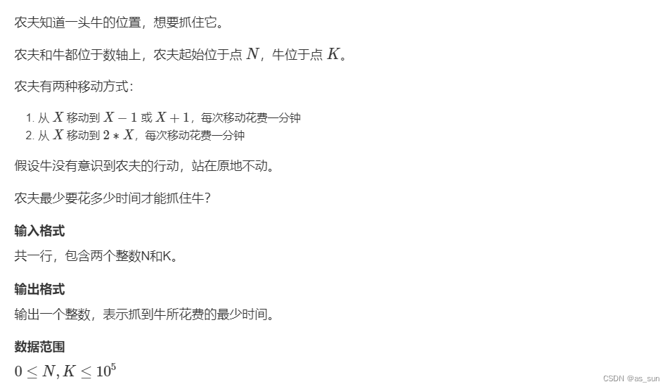 这里虽然是在数轴上,但仍旧是每个点有三种操作,求到另一个点的最短路,看着有点像贪心,但是实际上就是bfs暴搜。另外要注意一点,当牛在左边时,+1和2倍的操作都没有意义了,所以右边界实际上是2e5。