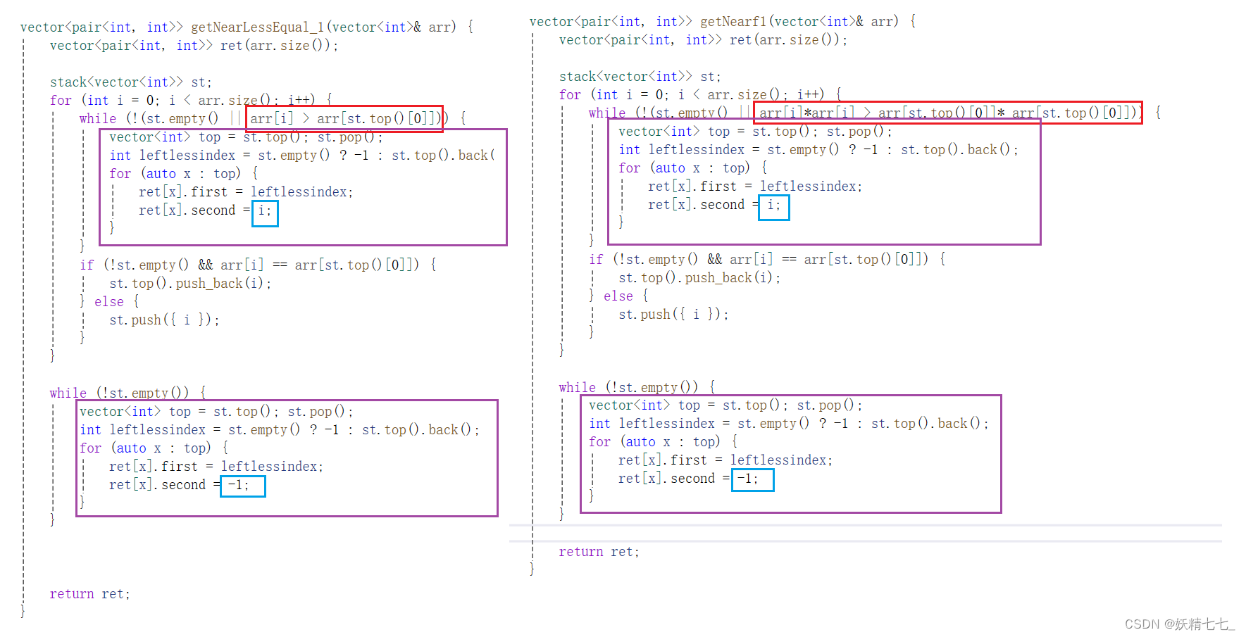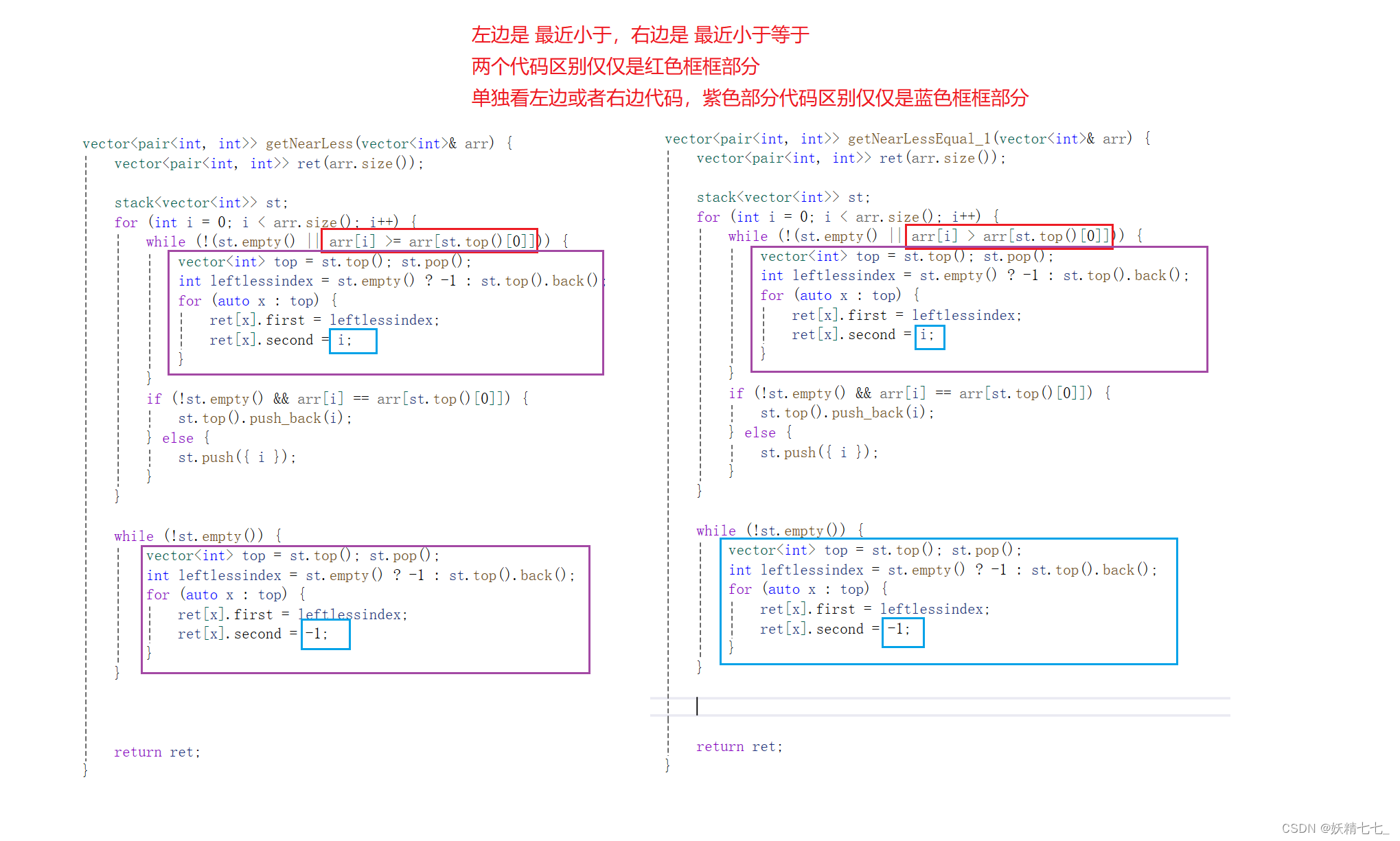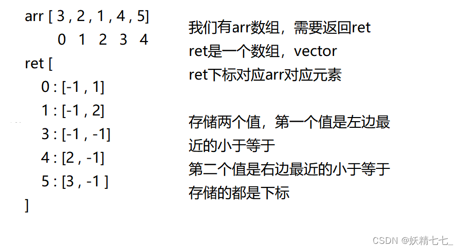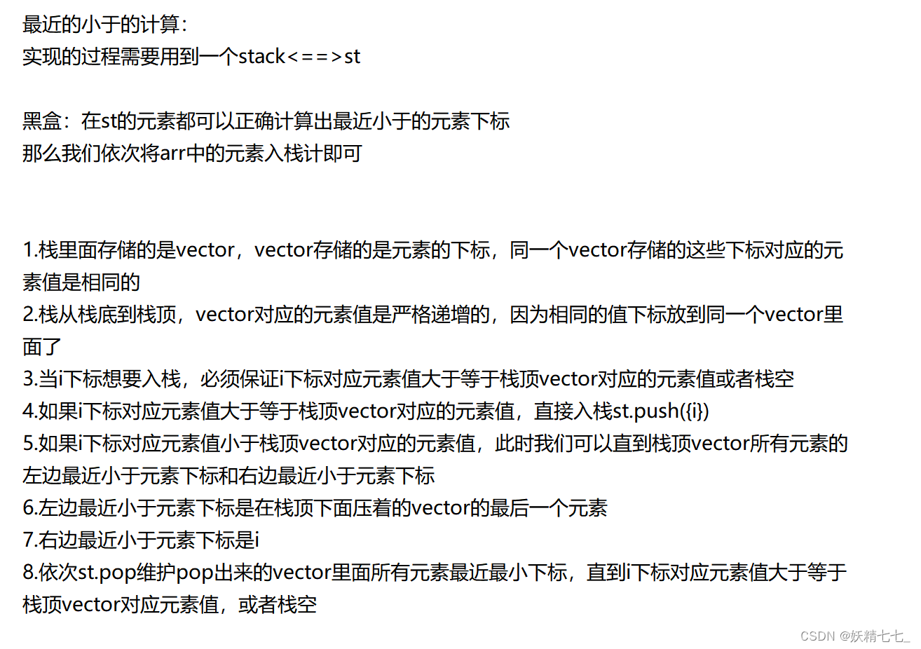 6.左边最近小于元素下标是在栈顶下面压着的vector的最后一个元素7.右边最近小于元素下标是i