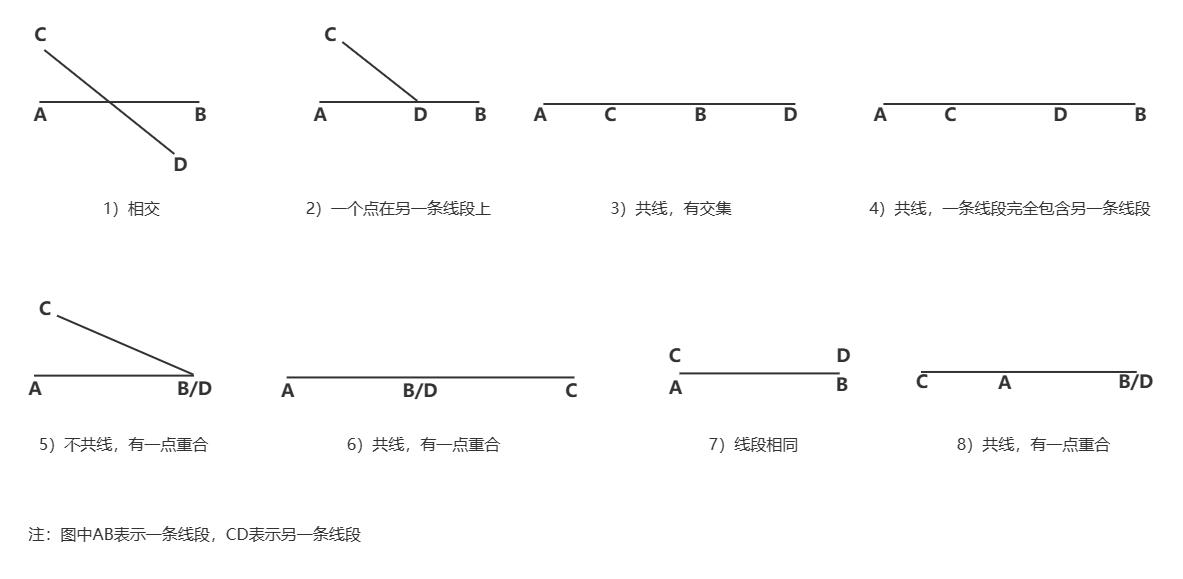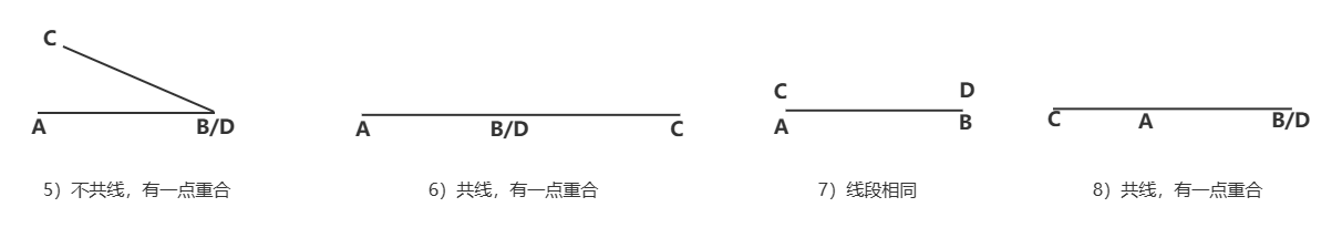 我们再仔细分析这些场景,我们会发现第5、第6、第7和第8这四种场景有一个共同特点是:存在线段的端点重合,而剩余的其它四个场景是不存在线段端点重合的。