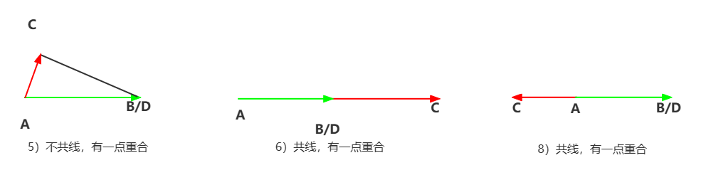 如果另一个端点不相等,我们则将不相等的两个点连接成向量(下图中第5、第6、第8场景中表示A、C两点连成向量,当然连成向量