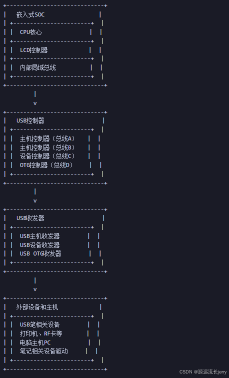 - USB总线驱动:USB总线驱动是内核空间中负责管理USB总线的驱动程序。它负责协调USB设备驱动与USB主机控制器之间的通信。当USB设备驱动需要与USB设备进行数据传输时,它会通过USB总线驱动来与USB主机控制器进行交互,由USB主机控制器来完成实际的数据传输操作。