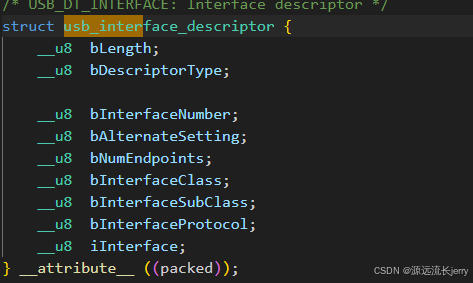 bInterfaceNumber:接口的唯一编号。bNumEndpoints:接口包含的端点数量(不包括端点0)。bInterfaceClass:接口的功能类别(如HID、Mass Storage等)。- 作用:定义接口的功能特性,驱动通常绑定到特定接口而非整个设备。