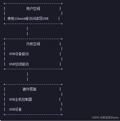 - 使用libusb库访问读写USB:在用户空间中,应用程序通过libusb库与USB设备进行通信。libusb是一个开源的库,它提供了一套API,使得用户空间的程序可以方便地与USB设备进行数据交换。应用程序通过调用libusb库中的函数,可以实现对USB设备的读写操作。