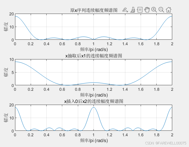 内插操作相当于在时域中增加采样点(零值点),等效于提高采样频率。在频谱压缩的同时,内插导致高频成分的幅度逐渐衰减。这种衰减现象是由零插值引入的,因为在频域中,插入零值会导致频谱中的能量分布更集中,从而在低频区域出现幅度的升高。
