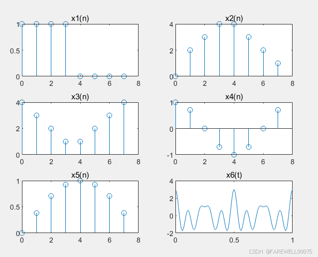 subplot(3,2,1);stem(0:length(x_3_5)-1,x_3_5,"filled");title("x5的波形");