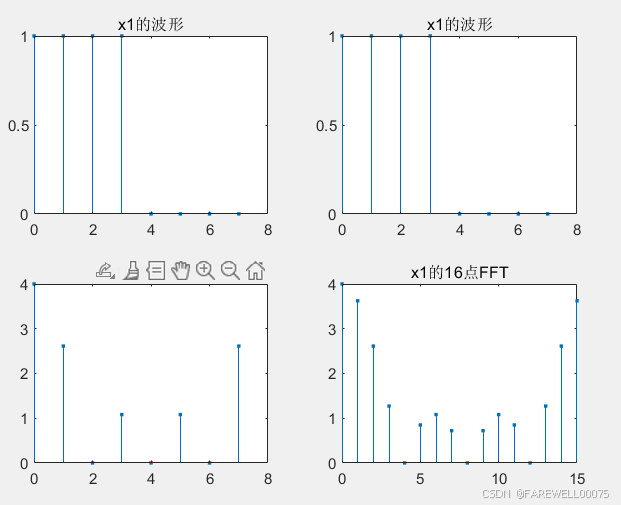 subplot(2,2,4);stem(0:N2-1,abs(yk_1),'.');title('x1的16点FFT');