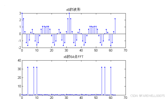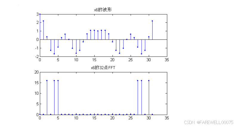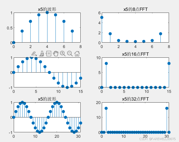 subplot(3,2,5);stem(0:length(z_3_5)-1,z_3_5,"filled");title("x5的波形");%32点