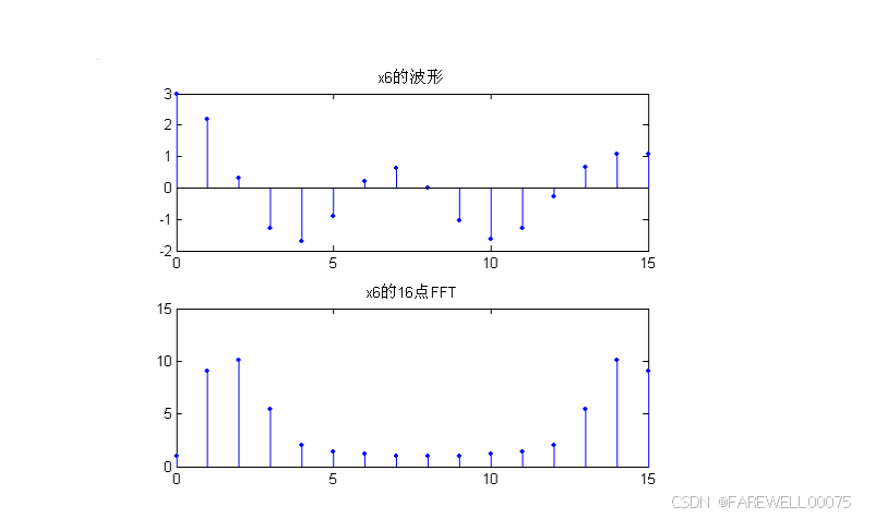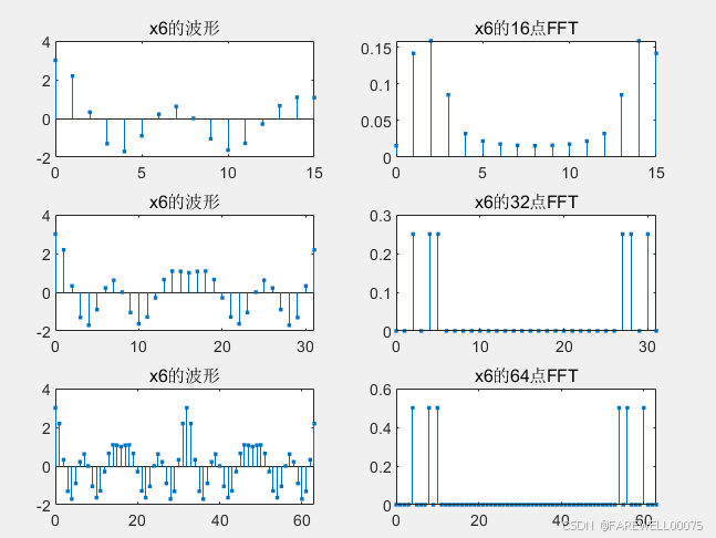 subplot(3,2,4);stem(0:N2-1,abs(yk_3_5),'filled');title('x5的16点FFT');