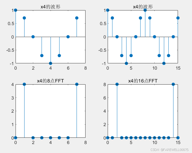 subplot(2,2,4);stem(0:N2-1,abs(yk_4),'filled');title('x4的16点FFT');