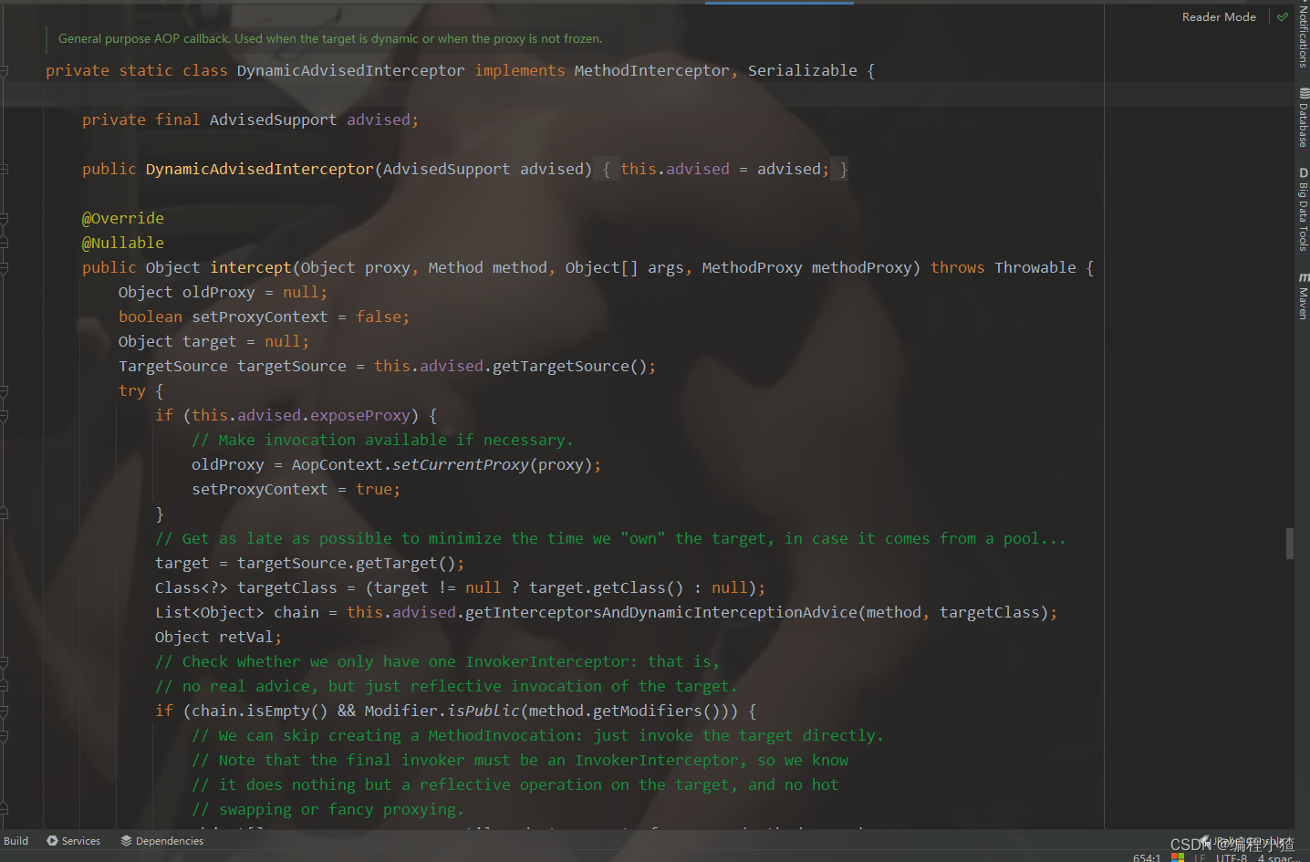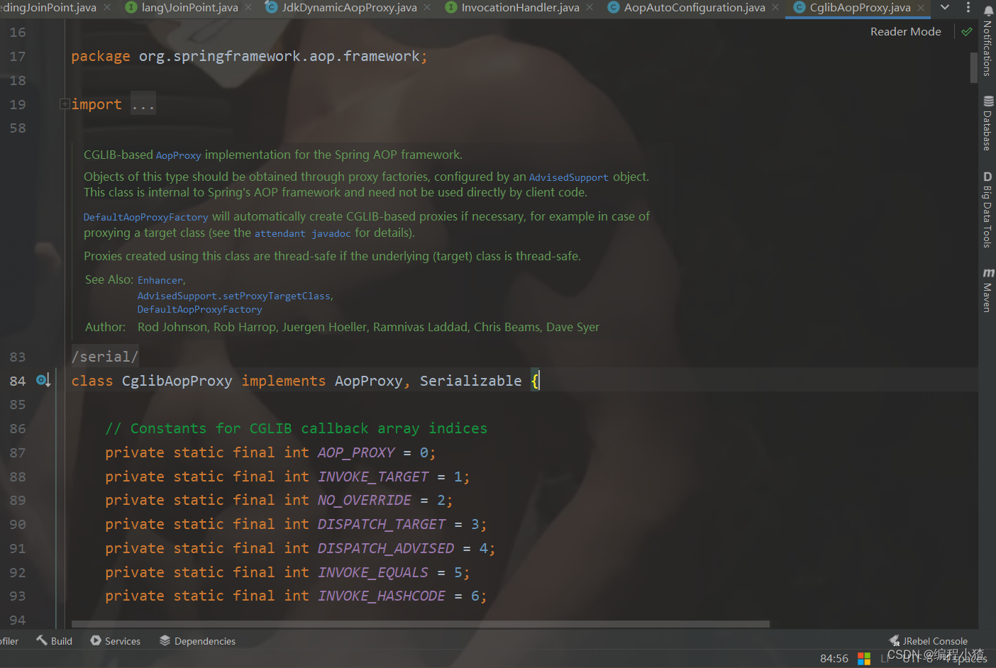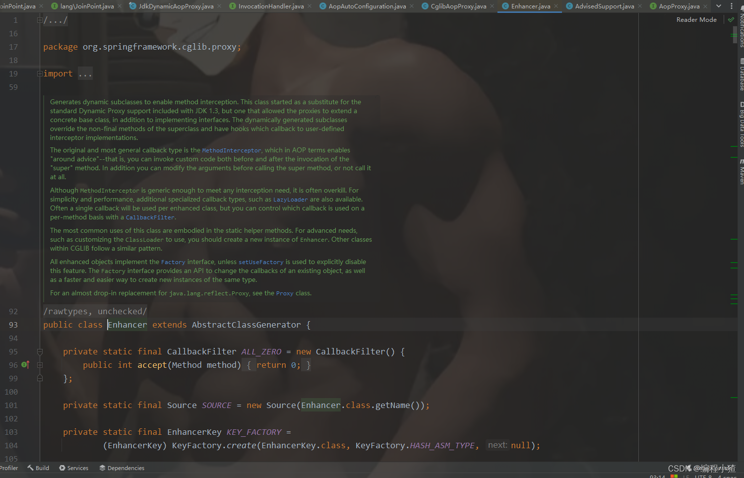 下面是CglibAopProxy类的部分源代码,感兴趣的读者可以自己去看看,我这里就不一一截图给大家看了。