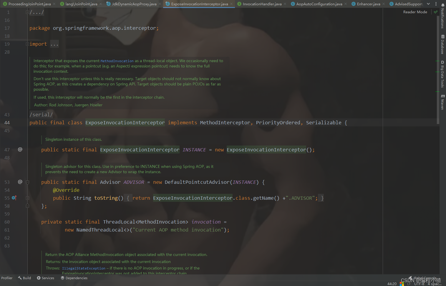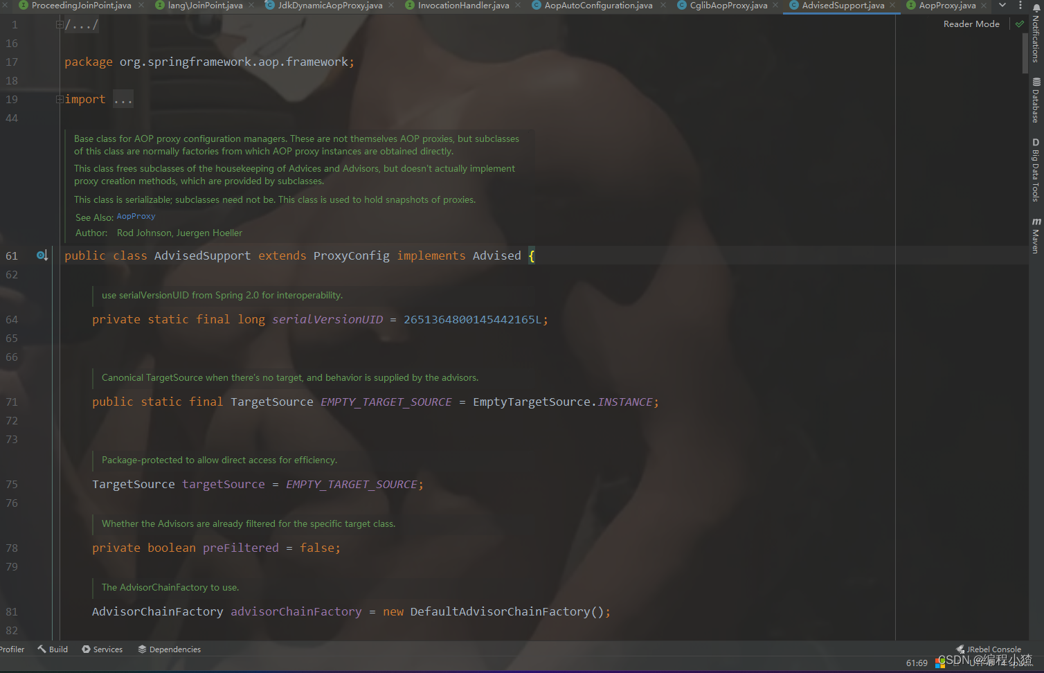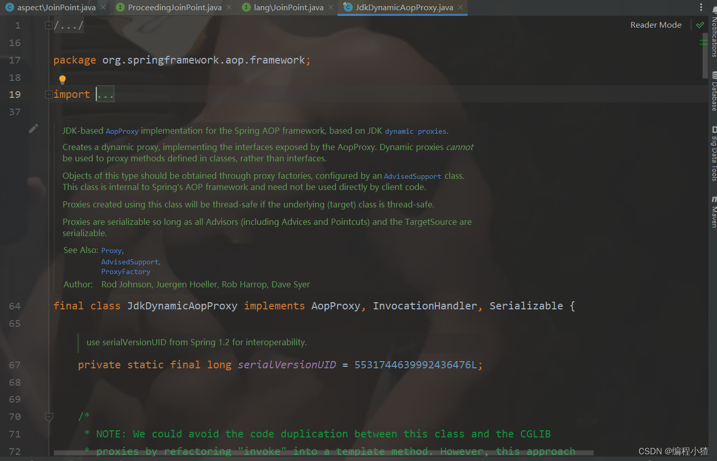 下面是JdkDynamicAopProxy类的部分源码,感兴趣的读者可以自己去看看,我这里就不一一截图给大家看了。