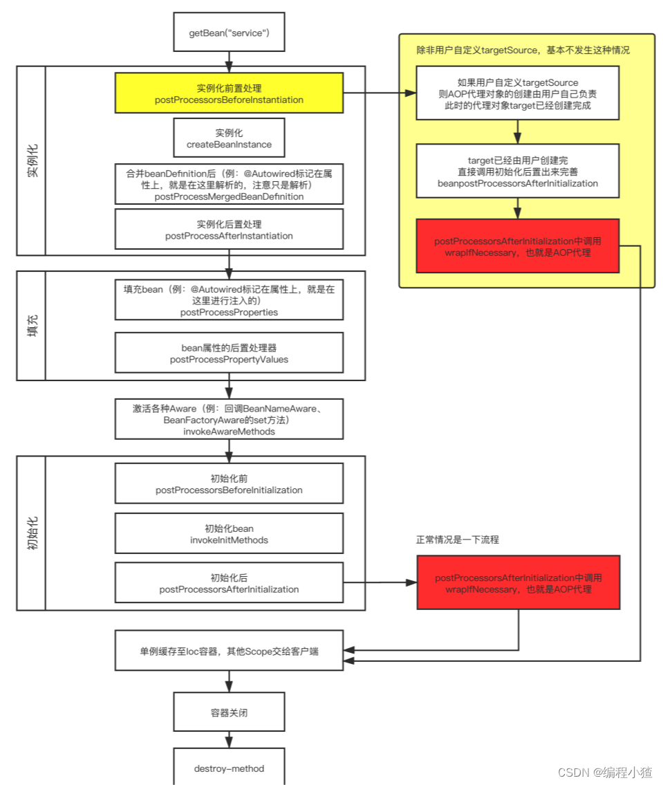 ,则bean的创建(实例化、填充、初始化)均由用户负责,Spring Ioc不会在管该代理目标对象traget,这种情况基本上不会发生,很多人用了几年Spring可能都不知道有它的存在- 正常情况下都是Spring Ioc完成代理对象target的实例化、填充、初始化。然后在初始化后置处理器中进行介入,对bean也就是service进行代理