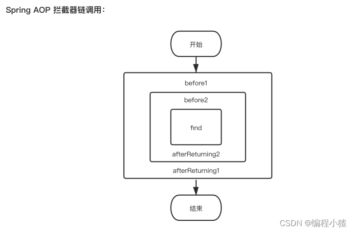 另外,对于同一个方法的多个切面,Spring AOP 会根据切面的顺序将它们的拦截器依次添加到拦截器链中,从而保证了它们的执行顺序。这样就可以保证 find 方法的执行顺序符合切面的定义顺序。