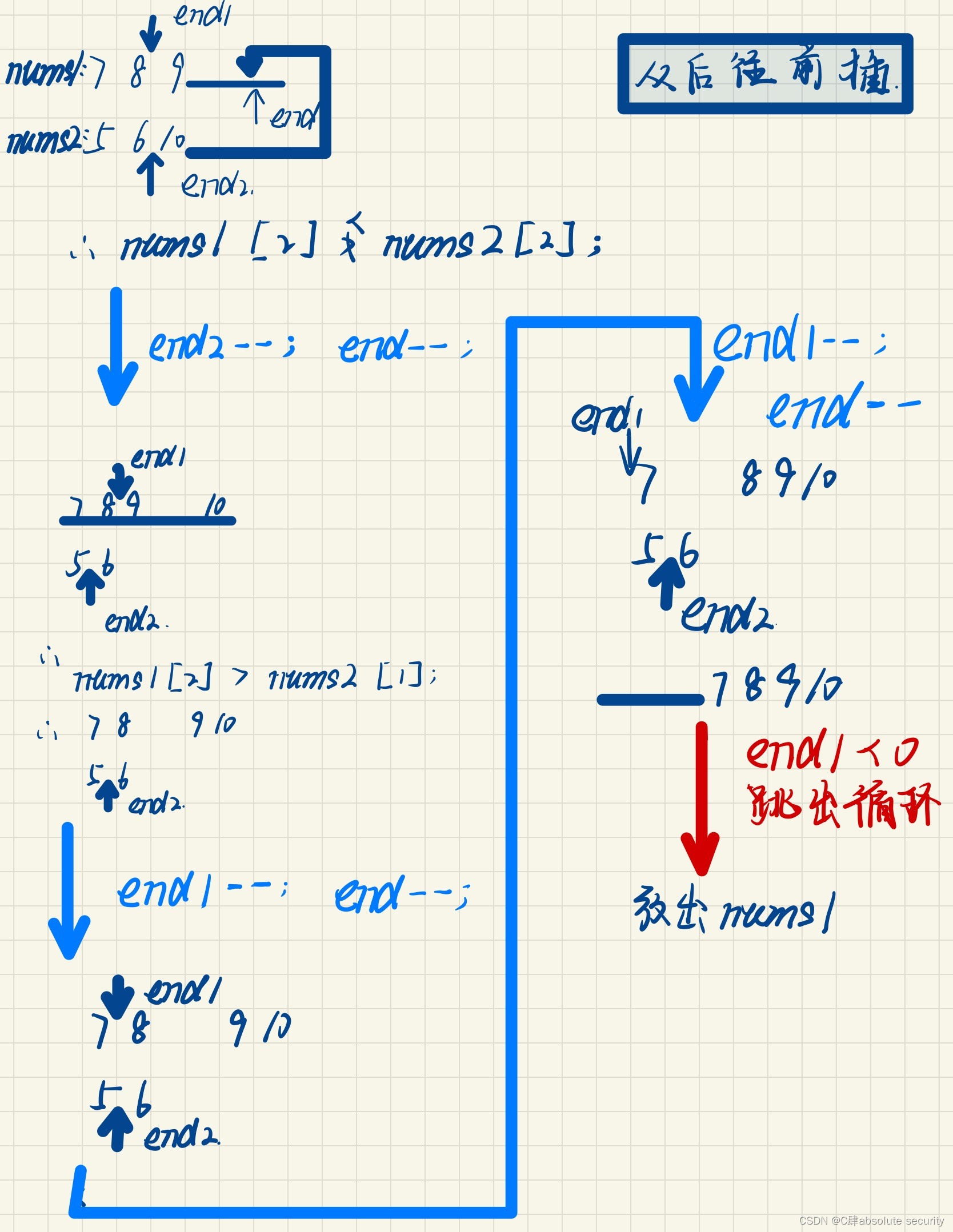 这段代码实现了合并两个有序数组的功能。它使用了三个指针end1、end2和end来分别指向nums1、nums2和合并后的结果数组nums1的末尾。